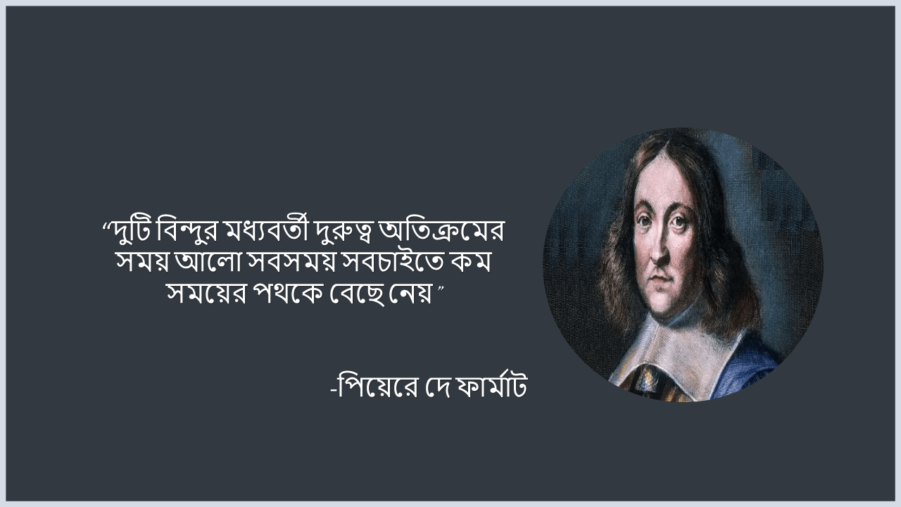 প্রিয় পাঠক, উপরের উদাহরণের পিছনে একটি বিশেষ উদ্দেশ্য আছে। আপনি কি জানেন যে, আলো পথ চলার সময়ে ঠিক একই মূলনীতি অনুসরণ করে? আলো এমন ভাবে পথ চলে যেন সে দ্রুততম সময়ে নির্ধারিত গন্তব্যে পৌঁছাতে পারে। অর্থাৎ, সংক্ষিপ্ত এবং দ্রুততম পথের তুলনায় আলো বেছে নেয় পরেরটিকে। সতের শতকের প্রথম ভাগে বিখ্যাত গনিতবিদ পিয়েরে দে ফার্মাট আলোর এই বিশেষ বৈশিষ্ট্য আবিষ্কার করেন। তার নাম অনুসারে এর নাম রাখা হয় ফার্মাটের নীতি। চলুন উদাহরণের মাধ্যমে বিষয়টি ব্যাখ্যা করা যাক।